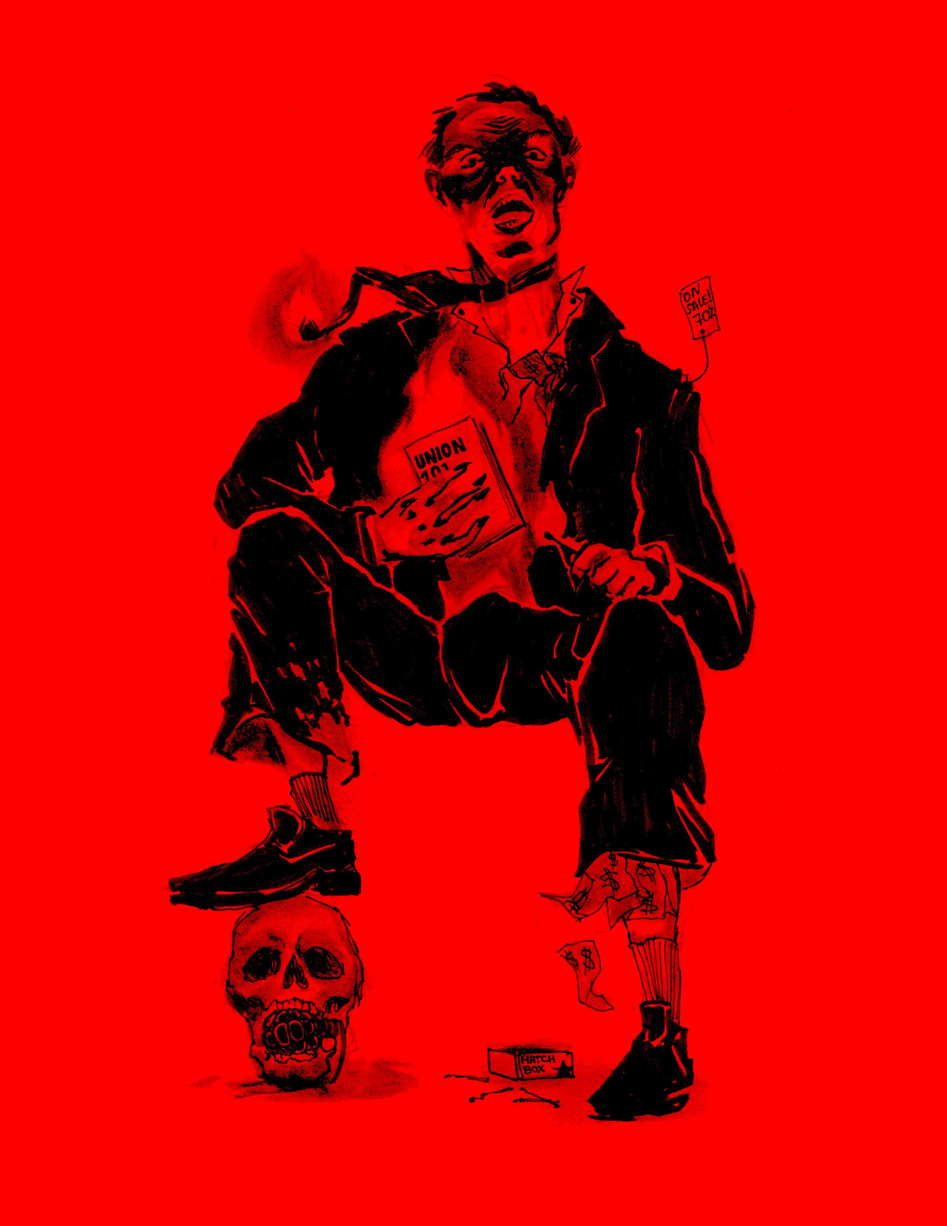 For my political perspective I wanted to encapsulate how the structure and foundation of capitalism are inherently fascist, and therefore capitalism is characterized by the process of increasing decay. Capitalism can only flourish at the expense of the working class (sweatshops, underpaid workers, minorities, breaking treaties, etc.), quality of products (cheap materials, single-use plastics, etc.) and the environment (global warming, oil spills, etc.). In fact, flourishing capitalism will ravage at the expense of everything, including its own self- serving system. (Marxists Internet Archive.) That is what I wanted to represent with my businessman at work. I wanted to use under lighting for my drawing to accentuate the eerie and disturbing nature of decaying capitalism. I used acetate as a sort of lens that, once removed, exposes capitalism for what it really is.